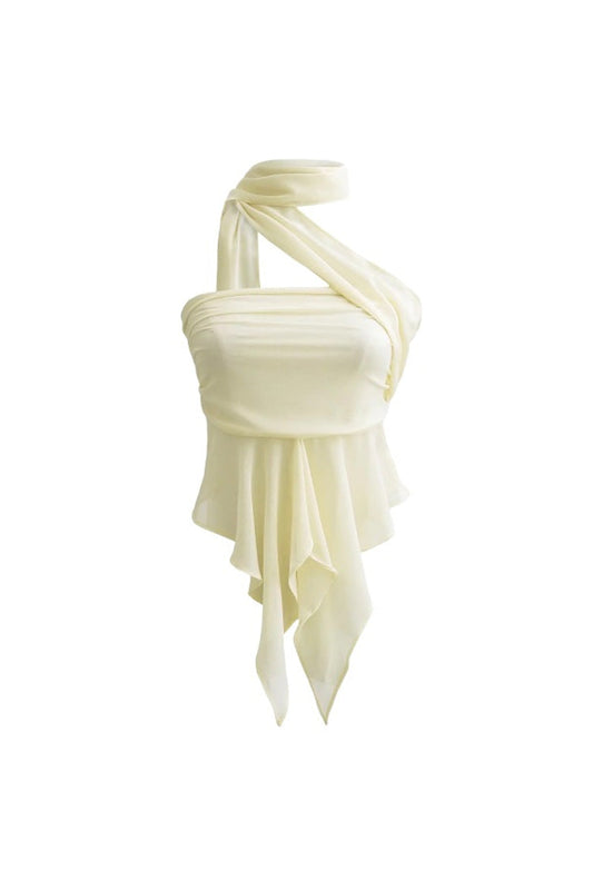 Wickelhalterloses Chiffon-Crop-Top mit Raffung, Drapierung und Peplum-Rüsche von Fudus