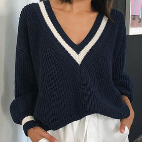 Dunkelblauer Damenpullover mit V-Ausschnitt im Old-Money-Stil
