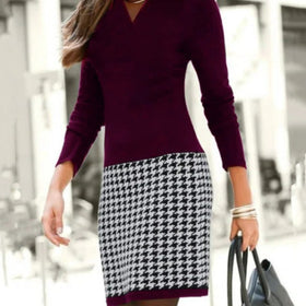 Farbblock-Kleid mit V-Ausschnitt und langen Ärmeln