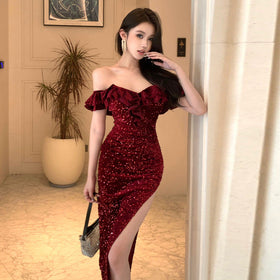 Private Celebrity Einteiler mit langem Rock. Schulterfrei, mit Schlitz. Ärmellos, Pullover, sexy Kleid. Patchwork/Splicing.