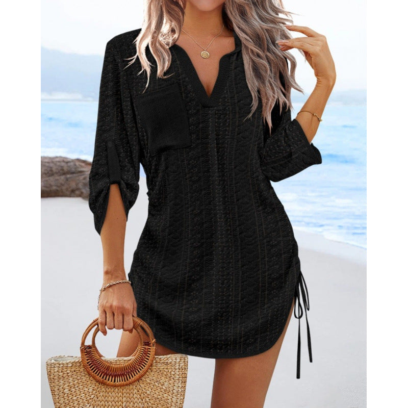 Lässiges Kleid im Pendlerstil. Kurzer Rock, V-Ausschnitt. Lange Ärmel, regulärer Ärmeltyp. Pullover-Verschluss. Patchwork/Splicing Design mit Bindeelementen. Einzelartikel.