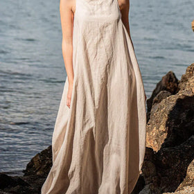 Elegantes Lena Maxikleid aus gerafftem Leinen. Stehkragen und Rückenausschnitt. - Hochwertiges Leinen. - Femininer Schnitt. - Verspielte Rüschendetails. - Perfekt für warme Tage und besondere Anlässe.