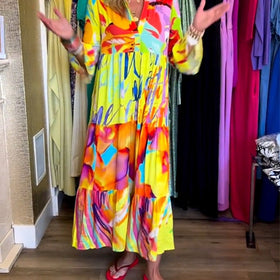 Das lebendige Muster verleiht Ihrer Kleidersammlung einen verspielten Touch, während die Schlagärmel eine schicke und moderne Silhouette bieten. Dieses Kleid wird mit großer Sorgfalt gefertigt, um eine schmeichelhafte Passform und ein angenehmes Tragegefühl zu gewährleisten.