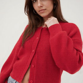 Leuchtend rote Strickjacke mit durchgehender Knopfleiste und leichtem Material. Ideal zum Überziehen über Shirts und Kleider.