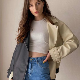 Die ModeGeist - Colour-Block-Lederjacke für Damen ist das perfekte Kleidungsstück für kühlere Tage und entspannte Abende. Diese Jacke besteht aus einer erstklassigen Kombination weicher, atmungsaktiver Stoffe und bietet unvergleichliche Wärme, Komfort und Stil. Ihr zeitloses Design mit lässiger Passform macht sie zu einem vielseitigen Begleiter für verschiedene Anlässe.