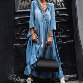 Dieses Maxi-Jeanskleid im Vintage-Stil mit V-Ausschnitt und trendigen 3/4-Ärmeln besticht durch schlichte Eleganz. Holen Sie sich den Look und das Selbstvertrauen, das Sie verdienen!