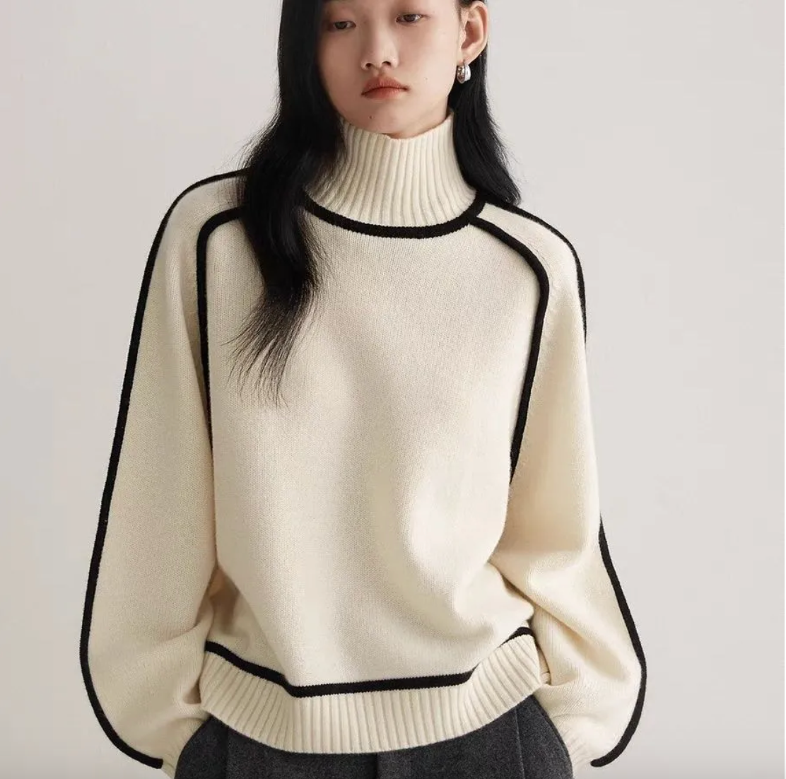 Dieser Rollkragenpullover mit Kontrastpaspel verkörpert durch seine zeitlose und minimalistische Ausstrahlung den Stil des alten Geldes. Die lockere Passform, kombiniert mit dem hohen Rollkragen und dem weichen Strick, strahlt mühelose Eleganz und dezenten Luxus aus.