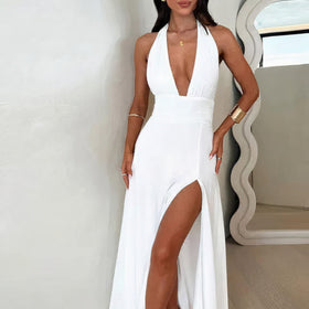 Enthüllen Sie Eleganz: Das Ilyza Spaghetti-Träger-Kleid mit tiefem V-Ausschnitt und Schlitz