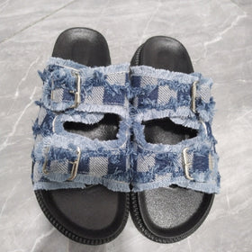 Trendige Damen-Sandalen mit Riemen und ausgefransten Denim-Details