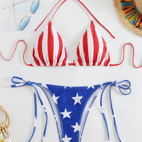 Elegantes und bequemes Femme Triangle Halter Neck Bikini Set mit Sternen- und Streifenmuster. Schmeichelhafte Passform für alle Körpertypen.