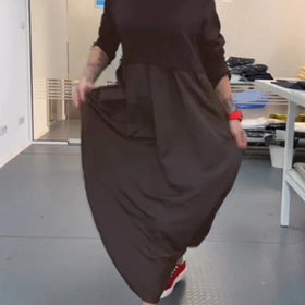 Stilvolles und bequemes Damen Maxikleid mit modischem Lagenlook und praktischen Taschen. Klassischer Rundhalsausschnitt, lange Ärmel und voluminöser Rock.