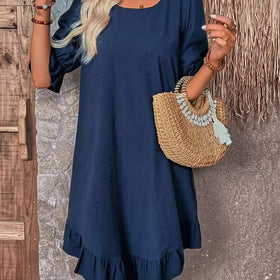 Stilvolles Damenkleid für sonnige Tage aus leichtem, atmungsaktivem Material. Elegantes Rundhalsdesign mit Rüschen am Saum.