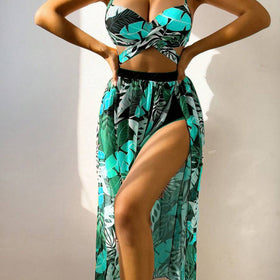 Unser Femme Two-Piece Tropical Print Badeanzug-Set mit transparenter Bedeckung vereint Stil und Komfort. Das Bikini-Oberteil hat ein stylisches Drehdetail und verstellbare Träger.