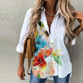 Verführerische Sommer-Tunika-Bluse mit üppigen Blumenmustern in kräftigen Farben. Hoher Tragekomfort durch lange Ärmel und geknöpften V-Ausschnitt. Ideal für Alltag und besondere Anlässe.