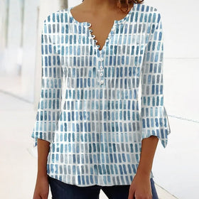 Dieses elegante Oberteil in blauem Aquarell und weißem Korbdruck verleiht Ihrem Sommer-Outfit eine moderne Note. Der V-Ausschnitt mit Knopfleiste, ¾-lange Ärmel und die leicht taillierte Passform bieten Komfort und Stil. Das einzigartige Muster und die hochwertigen Materialien unterstreichen Ihre modische Raffinesse.
