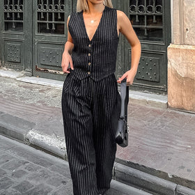 Erleben Sie das neue ärmellose Nadelstreifenanzug-Set mit V-Ausschnitt!