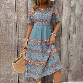 Das Lola Vintage-Kleid vereint Komfort und Stil. Lockere Passform und Laternenärmel verleihen ihm luftigen, bohemianen Charme – ideal für jede Gelegenheit. Die A-Linien-Silhouette und der V-Ausschnitt sorgen für einen schmeichelhaften, zeitlosen Look, der durch einzigartige geometrische Drucke künstlerisch aufgewertet wird. Es bietet ausserdem hervorragende Bauchabdeckung.