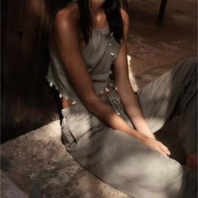 Stylischer Anzug mit weiter Hose und Kordelzug für modebewusste Frauen.