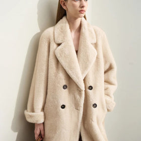 Dieser warme und stylische Wintermantel in luxuriösem Kunstfell präsentiert sich in klassischem Camel. Doppelreihig, mit Reverskragen und Raglanärmeln für eine elegante Silhouette. Praktische Knöpfe und Seitentaschen erhöhen den Komfort. Perfekt für kalte Tage.