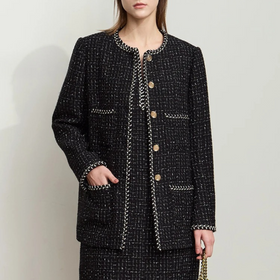 Elegante Tweed-Wolljacke mit Rundhalsausschnitt und langer Passform – perfekt zum Layern in der Winterzeit. Diese einreihige Jacke ist mit Schulterpolstern für mehr Struktur und langen Ärmeln ausgestattet. Dekorative Knöpfe, Taschen und mit Band eingefasste Kanten runden das raffinierte Design ab.