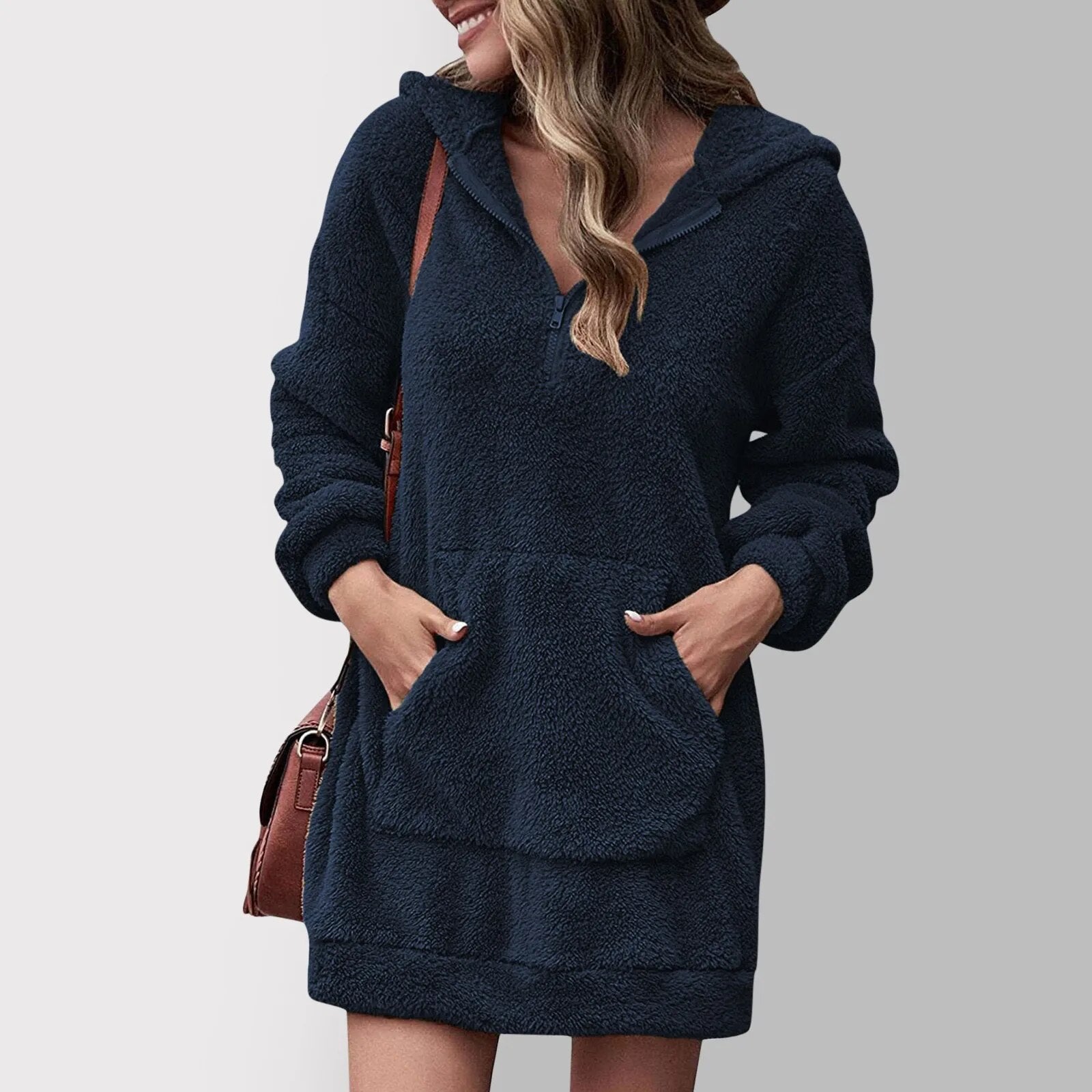Für einen mühelosen, stylischen Look diese Saison: Dieser Pullover ist perfekt! Entdecken Sie unser flauschiges Kapuzen-Pullover-Kleid – stylisch und bequem, es kombiniert Pullover-Gemütlichkeit mit dem Chic eines Kleides. Dieses vielseitige Kleidungsstück hält warm und setzt ein modisches Statement in den kalten Monaten.